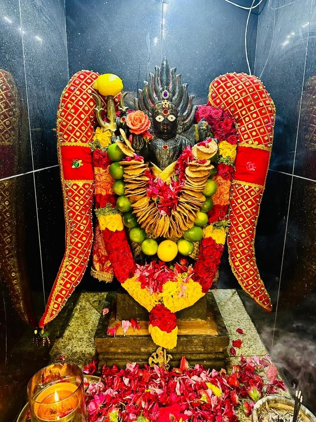 I meditate on the Mother, whose eyes are smiling, who holds the arrow, bow, noose and the goad in Her hands. She is glittering with red garlands and ornaments. She is painted with kumkuma on her forehead and is red and tender like the japa flower.